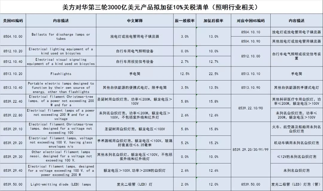 据统计,3000亿美元拟征税清单共包括3805个HS编码,涵盖了前两轮已被加征关税的500美元和2000亿美元产品之外的几乎所有产品。这一轮加征关税目录中包含的照明产品2018年对美出口额超过20亿美元,占2018年中国照明产品对美出口总额的18.2%;其中金额最大一项为HS编码为85395000的LED替换光源,2018年对美出口总额达到17.68亿美元。