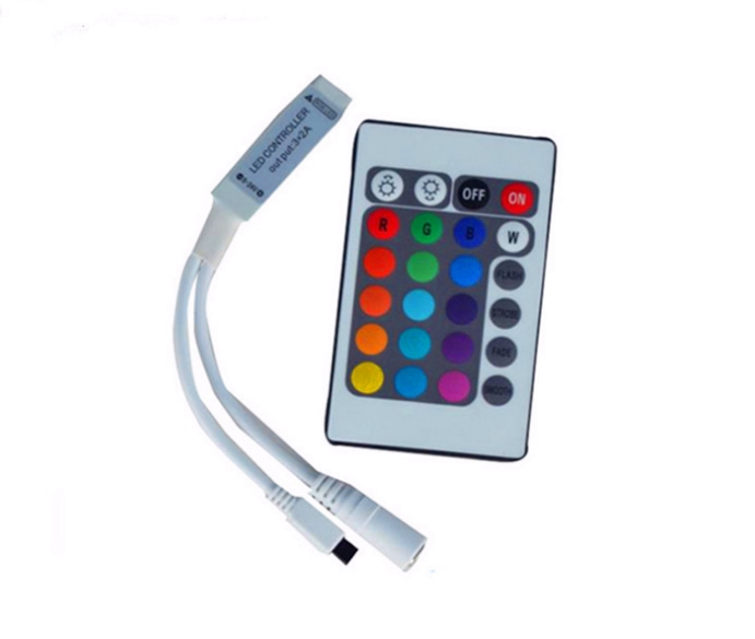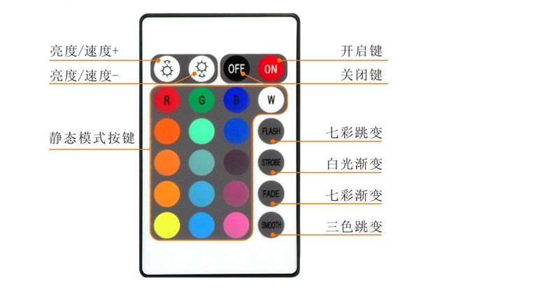 24键红外控制器多功能LED RGB控制器采用先进的微电脑控制,用于控制各种以LED为光源的灯具;具有20种功能模式选择,价格低廉,接线简单,使用方便等优点;可通过红外遥控器进行控制LED灯功能变化,速递调节,亮度调节,静态颜色选择以及各种动态灯光变化效果。