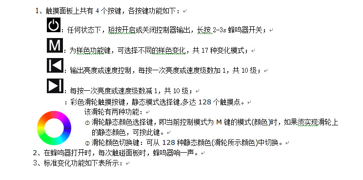 触摸面板控制器是我司新研发的新型高档控制器,采用玻璃面板设计,外观美观、时尚。采用高精度电容触摸控制芯片,增加了触摸的灵敏度,减少误触发。其用于控制各种以led为光源的灯具,例如:点光源,软光条,洗墙灯,面板灯等;具有接线方便,使用简单等优点;根据客户实际需求可实现跳变、渐变、频闪等灯光变化效果。